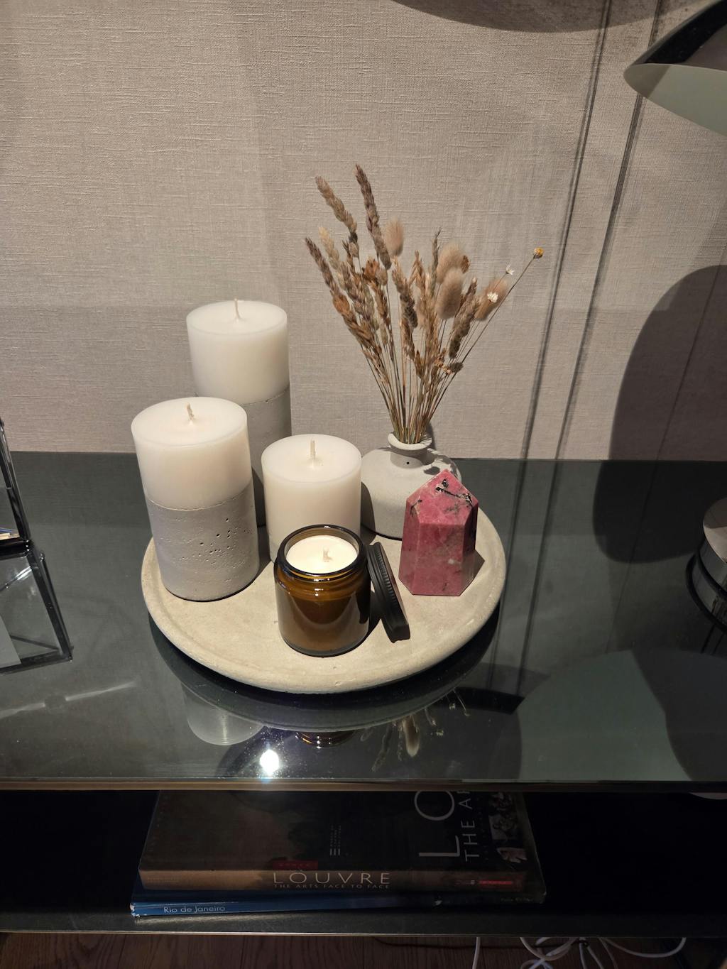 Set completo de velas, aroma y decoración: 3 velas de hormigón (sin aroma), 1 vela 100% soja aroma Peonía 100 ml, bandeja de hormigón natural redonda 27 cm y florero cilindro ancho de hormigón natural con ramo de flores secas.