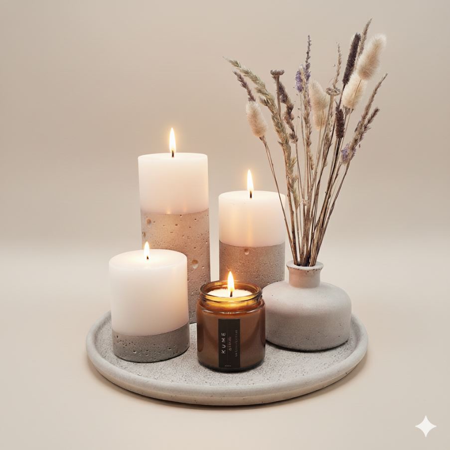 Set completo de velas, aroma y decoración: 3 velas de hormigón (sin aroma), 1 vela 100% soja aroma Peonía 100 ml, bandeja de hormigón natural redonda 27 cm y florero cilindro ancho de hormigón natural con ramo de flores secas.