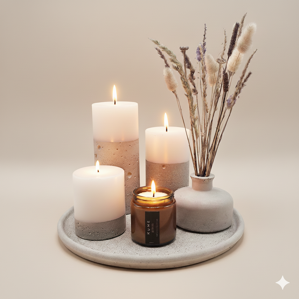 Set completo de velas, aroma y decoración: 3 velas de hormigón (sin aroma), 1 vela 100% soja aroma Gardenia 100 ml, bandeja de hormigón natural redonda 27 cm y florero cilindro ancho de hormigón natural con ramo de flores secas.